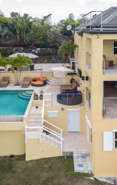 Located on a ridge 300 ft. above town, the recently renovated Outrigger Villa, formerly Outrigger House, affords views of the mesmerizing Charlotte Amalie harbor with cruise ships on the Caribbean Sea, yachts, marine ports, downtown and the neighboring Water & Hassel islands' vistas. Featuring 7500 sq. ft. of covered decking, and an infinity edged pool.